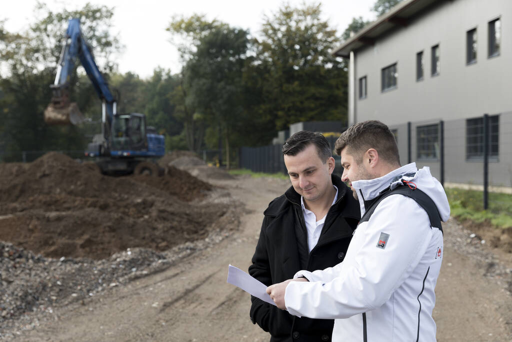 Parylak: Auf dem Grundstück hinter uns entsteht zurzeit unser neuer Firmensitz. Insgesamt wird unser Neubau deutlich größer sein als unser bisheriger Firmensitz in Köln-Kalk. Am aktuellen Standort haben wir nur ein Büro für vier Mitarbeitende. Auch Lagerkapazitäten und Parkplätze für unseren Fuhrpark sind knapp. Den Platz dafür werden wir hier künftig haben. Man kann also sagen: Mit mittlerweile 16 Mitarbeitenden sind wir unserem Standort in Kalk in den vergangenen Jahren entwachsen.